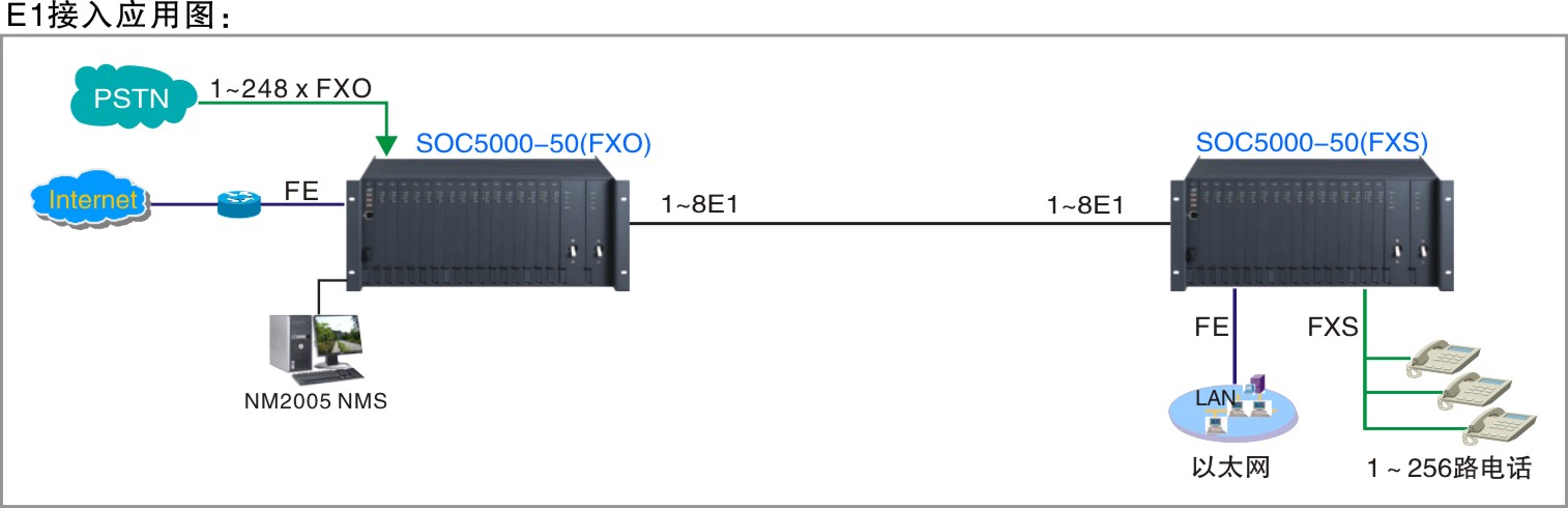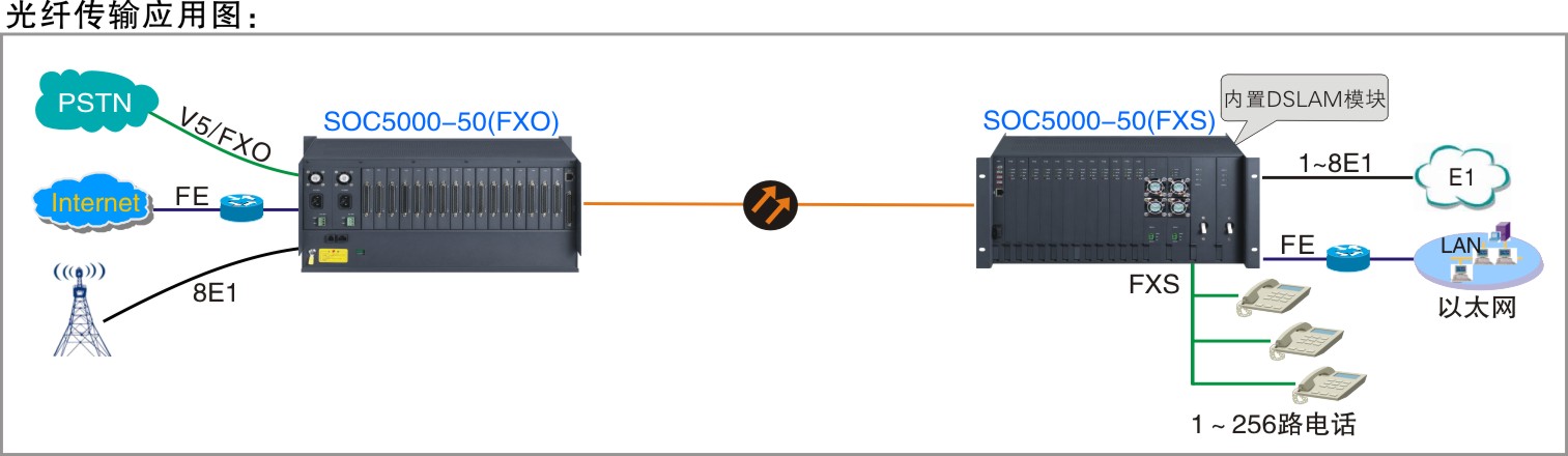 SOC5000-50是根據(jù)當(dāng)前客戶對接入方式與業(yè)務(wù)需求多樣化而研發(fā)的綜合接入設(shè)備,主要用于語音、數(shù)據(jù)通信網(wǎng)絡(luò)中的各種業(yè)務(wù)接入、復(fù)用、傳輸。設(shè)備采用19英寸5U標(biāo)準(zhǔn)機(jī)箱,19槽插卡式結(jié)構(gòu)設(shè)計(jì)。集成PDH/SDH/E1/V5等多種線路接口,支持FXO/FXS/DSL/E1/數(shù)據(jù)盤等各種業(yè)務(wù)盤卡的大容量業(yè)務(wù)接入以及混插技術(shù),充分體現(xiàn)其靈活和兼容性,為客戶在原有傳輸構(gòu)架上提供性價(jià)比更高的傳輸接入方案,特別適用于“光進(jìn)銅退”工程綜合業(yè)務(wù)接入。此系列產(chǎn)品也能起到多通道保護(hù),當(dāng)設(shè)備選擇E1通道傳輸?shù)臅r(shí)候,任意1個(gè)E1可以傳輸128路語音,節(jié)約E1資源;還可起到“1+7通道保護(hù)”的功能,并且切換期間能保持話路通暢;同時(shí)起到保密跟線路檢測的功能。其廣泛應(yīng)用于各運(yùn)營商、廣電網(wǎng)和公安、部隊(duì)(保密)、電力、鐵路、公路、交通、金融、政府及具有分支機(jī)構(gòu)的企事業(yè)單位專網(wǎng)。